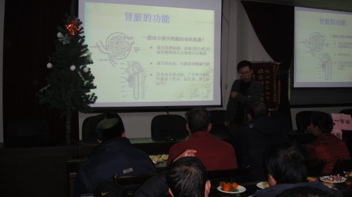 聯(lián)誼會由腎內(nèi)科血液凈化中心護士長羅桂萍主持,她感謝廣大腎友長期以來對血液凈化中心的理解、支持和配合,同時也表達了腎內(nèi)科全體醫(yī)護人員對長期遭受疾病困擾的廣大腎友的同情、關(guān)心和關(guān)愛。針對患者及家屬最關(guān)心的腎病并發(fā)癥的預(yù)防,飲食與營養(yǎng),透析生存質(zhì)量及居家護理等實際問題,科主任雷天濤、護士長羅桂萍均采用了多媒體的形式做了圖文并茂、細致通俗地講解,便于病友和家屬掌握正確的治療和護理方法。