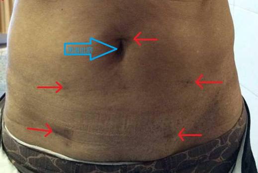 據(jù)譚曙光主任介紹,隨著微創(chuàng)外科和功能外科的興起,盡可能減少創(chuàng)傷并保留機(jī)體的功能已成為外科醫(yī)生追求的更高目標(biāo)。在諸多的微創(chuàng)技術(shù)中,經(jīng)自然腔道內(nèi)鏡手術(shù)(NOTES)的發(fā)展是備受關(guān)注的熱點(diǎn)之一。在腹腔鏡直腸癌微創(chuàng)手術(shù)中,充分利用自然腔道取出標(biāo)本并完成消化道重建,此類術(shù)式除腹部五個(gè)鑰匙孔大小的操作孔外(見(jiàn)圖紅色箭頭所示),無(wú)其他切口,縮短了手術(shù)時(shí)間,更加符合功能外科的理念,不僅極大減輕了患者的術(shù)后疼痛,而且可以得到令人滿意的美容效果。另外,此類手術(shù)很大程度地減少了術(shù)后切口腫瘤種植、切口疼痛、切口感染、切口疝等并發(fā)癥的發(fā)生,也減少了傳統(tǒng)腹腔鏡手術(shù)中腹腔臟器在空氣中的暴露,引起術(shù)后腸粘連、腸梗阻的幾率,縮短了患者的康復(fù)周期。