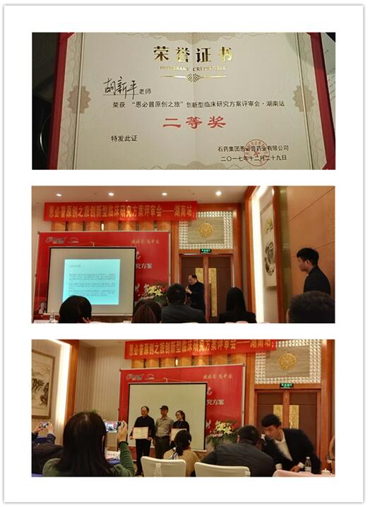 神內(nèi)科胡新平主任喜獲“恩必普原創(chuàng)之旅”創(chuàng)新型臨床研究方案評(píng)審會(huì)二等獎(jiǎng) 發(fā)布時(shí)間:2018年1月5日 預(yù)覽:2106次 通訊員劉立君報(bào)道: 12月29號(hào),在長(zhǎng)沙舉辦的“恩必普原創(chuàng)之旅”創(chuàng)新型臨床研究方案評(píng)審會(huì)上,我院神內(nèi)科胡新平主任以《丁苯酞聯(lián)合高壓氧對(duì)急性缺血性腦卒中側(cè)支循環(huán)的作用研究》為課題,經(jīng)過演講、匯報(bào)、專家評(píng)審等環(huán)節(jié)綜合評(píng)比,最終脫穎而出,喜獲二等獎(jiǎng)。 此次評(píng)審會(huì)參賽專家共計(jì)13人,分別來自中南大學(xué)湘雅醫(yī)院、湖南省人民醫(yī)院、長(zhǎng)沙市第一醫(yī)院、南華大學(xué)附屬第一醫(yī)院等省內(nèi)大型醫(yī)院,課題主要圍繞藥物丁苯酞對(duì)腦卒中的治療作用進(jìn)行研究。評(píng)審專家由中南大學(xué)湘雅醫(yī)院的肖波教授、楊曉蘇教授,中南大學(xué)湘雅二醫(yī)院的胡治平教授、中南大學(xué)湘雅三醫(yī)院的宋治教授、湖南省第二人民醫(yī)院的楊松林教授等湖南省神經(jīng)內(nèi)科領(lǐng)域具有重要影響力的教授組成。胡新平主任在評(píng)審會(huì)現(xiàn)場(chǎng),對(duì)自己的課題《丁苯酞聯(lián)合高壓氧對(duì)急性缺血性腦卒中側(cè)支循環(huán)的作用研究》進(jìn)行了精彩匯報(bào),經(jīng)過專家的認(rèn)真遴選,榮獲了二等獎(jiǎng)。 “恩必普原創(chuàng)之旅”是為探索腦卒中治療臨床研究中的新方向,提高腦卒中的治療水平,促進(jìn)中國(guó)創(chuàng)新型中青年醫(yī)生的成長(zhǎng),由恩必普藥業(yè)公司支持和開展的一項(xiàng)中國(guó)原創(chuàng)藥物創(chuàng)新性臨床研究方案征集活動(dòng)。 胡新平主任的課題《丁苯酞聯(lián)合高壓氧對(duì)急性缺血性腦卒中側(cè)支循環(huán)的作用研究》在創(chuàng)新臨床研究方案評(píng)審會(huì)上的獲獎(jiǎng),將進(jìn)一步激發(fā)我院廣大醫(yī)務(wù)人員在科研方面的熱情和興趣,提高我院在湖南省神經(jīng)內(nèi)科領(lǐng)域的影響力。