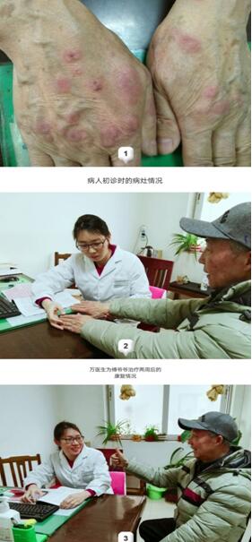 11月9日這天我來到中心醫(yī)院門診皮膚科見到一位很年輕的女醫(yī)生,認為年輕醫(yī)生經(jīng)驗不足、見識不多,頓時我求醫(yī)的心跌至谷底,然而這位醫(yī)生卻出乎意料之外,她隨即叫我伸出雙手仔細觀察病灶、認真診治并用手機拍了個發(fā)病的病灶,胸有成竹的診斷我的病為“多形紅斑”,并告知了該病的后果嚴重性。經(jīng)她精心的治療及第二次復診使用的內(nèi)服、外用藥一星期多基本控制了病情,兩周后徹底痊愈。幸運這次遇上了年輕有為的萬醫(yī)生,才使我脫離了疾病的折磨和痛苦。