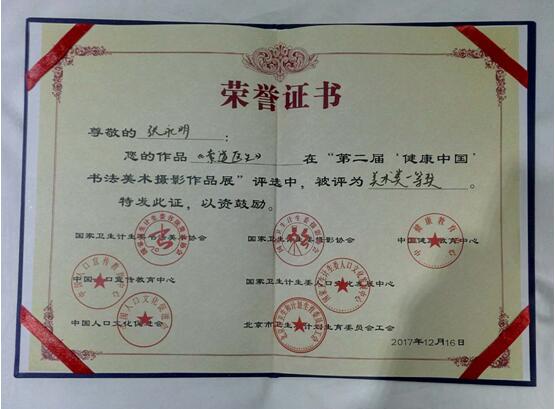 張永明喜獲“健康中國”書法美術(shù)攝影賽大獎 發(fā)布時(shí)間:2018年2月8日 預(yù)覽:1751次 為大力推進(jìn)“健康中國”建設(shè),全方位倡導(dǎo)大健康理念,慶祝黨的十九大勝利召開,由國家衛(wèi)生計(jì)生委書法美術(shù)協(xié)會、國家衛(wèi)生計(jì)生委攝影協(xié)會、中國健康教育中心、中國人口宣傳教育中心、人口文化發(fā)展中心、中國人口文化發(fā)展促進(jìn)會,中國家庭報(bào)社承辦的“第二屆‘健康中國’書法美術(shù)攝影作品展”于2017年12月16日—17日在北京國際會議中心隆重舉辦。我院門診辦支部書記張永明的美術(shù)作品國畫《索道醫(yī)生》榮獲一等獎、攝影作品《黨員醫(yī)療隊(duì)深入山區(qū)義診》榮獲優(yōu)秀獎,這是張永明繼去年在省衛(wèi)計(jì)委工會舉辦的書法、美術(shù)、攝影獲雙獎后又一次飛躍。 全國衛(wèi)生計(jì)生系統(tǒng)人才薈萃,活動組委會今年7月15日開始作品征集,共收到全國30多個(gè)省、市、自治區(qū)書畫、攝影藝術(shù)家及愛好者的書畫653幅,攝影作品1871幅,從參賽作品中精選出了近三百幅佳作付梓展出,書法作品楷、隸、篆、行、草等領(lǐng)異標(biāo)新;美術(shù)作品:山水、花鳥、人物等各擅勝場;攝影作品:風(fēng)光、紀(jì)實(shí)、人物等形神兼?zhèn)洹W髡叨鄶?shù)來自全國衛(wèi)生計(jì)生一線,他們在緊張工作之余,特別對衛(wèi)生計(jì)生戰(zhàn)線的風(fēng)物人情盡心謳歌,突出反映了我國衛(wèi)生計(jì)生系統(tǒng)文化領(lǐng)域的重要地位與作用。作品生動展現(xiàn)了全國衛(wèi)生計(jì)生系統(tǒng)干部職工建設(shè)健康中國銳意進(jìn)取、奮發(fā)有為的精神風(fēng)貌。 第二屆“健康中國”書法美術(shù)攝影開幕式和展出地點(diǎn)在北京會議中心舉辦,12月16日開幕式后,進(jìn)行了頒獎,參觀展覽的人群來自全國各地四面八方,參觀后還開展了書畫藝術(shù)家筆會;12月17日書法、美術(shù)、攝影藝術(shù)講座還邀請了全國著名專家前來授課。 出席展出會開幕式的主要領(lǐng)導(dǎo)有國家衛(wèi)生計(jì)生委副主任、委書法美術(shù)協(xié)會主席金小桃,國家衛(wèi)生計(jì)生委醫(yī)政醫(yī)管局巡視員、委攝影協(xié)會副會長兼秘書長李路平,國家衛(wèi)生計(jì)生委計(jì)劃生育家庭發(fā)展司副司長莫麗霞,國家衛(wèi)生計(jì)生委機(jī)關(guān)黨委常務(wù)副書記、委書法美術(shù)協(xié)會副主席楊建立,國家衛(wèi)生計(jì)生委直屬機(jī)關(guān)工會常務(wù)副主席楊志媛,北京市衛(wèi)生計(jì)生委黨委委員、副主任、工會主席李彥梅等。