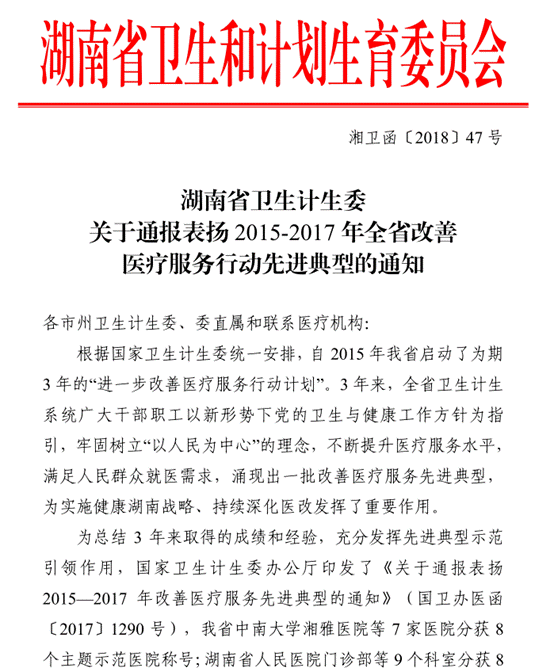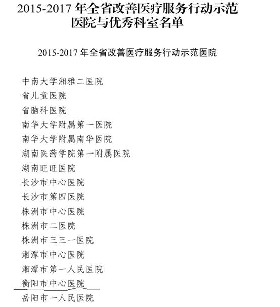 衡陽(yáng)市中心醫(yī)院榮獲全省改善醫(yī)療服務(wù)行動(dòng)示范醫(yī)院 發(fā)布時(shí)間:2018年4月3日 預(yù)覽:1781次 通訊員吳華報(bào)道:近日,湖南省衛(wèi)生與計(jì)劃生育委員會(huì)發(fā)文,并在2018年全省醫(yī)政工作會(huì)議上通報(bào)表?yè)P(yáng)2015-2017年全省改善醫(yī)療服務(wù)行動(dòng)先進(jìn)典型,市中心醫(yī)院榮獲“全省改善醫(yī)療服務(wù)行動(dòng)示范醫(yī)院”稱號(hào)。 2015年在國(guó)家衛(wèi)計(jì)委的統(tǒng)一安排下,我省啟動(dòng)為期3年的“進(jìn)一步改善醫(yī)療服務(wù)行動(dòng)計(jì)劃”。3年來,市中心醫(yī)院本著以“患者為中心”的服務(wù)理念,不斷改進(jìn)服務(wù)流程,提高醫(yī)療質(zhì)量,特別是在2017年新領(lǐng)導(dǎo)班子上任之后,在總結(jié)前兩年工作的基礎(chǔ)上,在全院干部職工中開展“視醫(yī)德為生命、待病人如親人”主題教育活動(dòng)。目前主題教育活動(dòng)已經(jīng)取得了階段性成效,醫(yī)院服務(wù)意識(shí)明顯增強(qiáng),服務(wù)能力明顯提高,干部職工精神面貌明顯好轉(zhuǎn),業(yè)務(wù)發(fā)展態(tài)勢(shì)明顯改善。 2018-2020年為我省第二個(gè)“進(jìn)一步改善醫(yī)療服務(wù)行動(dòng)計(jì)劃”活動(dòng)年,市中心醫(yī)院表示,將繼續(xù)以行動(dòng)計(jì)劃為今后的工作重點(diǎn),歸納總結(jié)主題教育活動(dòng)經(jīng)驗(yàn),不斷優(yōu)化醫(yī)院服務(wù)舉措,認(rèn)真落實(shí)醫(yī)療核心制度,狠抓醫(yī)療質(zhì)量和醫(yī)療安全,為群眾提供更為優(yōu)質(zhì)的醫(yī)療服務(wù)與就醫(yī)體驗(yàn)。