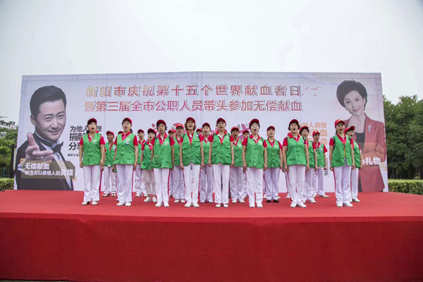今年6月14日是第十五個世界獻血者日,衡陽市慶祝的方式是全市公職人員帶頭參與,擼袖獻血。昨日上午,該市600余名公職人員無償獻血志愿者聚集在太陽廣場,以這樣一種特殊的方式,為第十五個世界獻血者日增添一抹亮點。