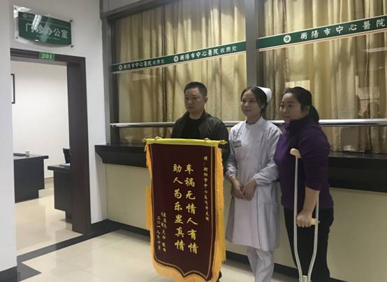 10月25日,市中心醫(yī)院來了一對特殊的夫妻,妻子腿腳并不利索,由丈夫攙扶著,走進了門診辦公室,丈夫一手攙扶著妻子,一手拿著一面錦旗和一封感謝信:原來他們是專程過來感謝衡陽市中心醫(yī)院門診護士許燕暉的,3個月前發(fā)生的一件隱姓埋名做好事的感人事情也隨之浮出水面。