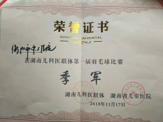 羽毛球代表隊(duì)喜獲湖南兒科醫(yī)聯(lián)體季軍 發(fā)布時(shí)間:2018年11月22日 12:41:30 預(yù)覽:2541次 蔣方明報(bào)道:11月16日—17日,劉志偉副院長帶領(lǐng)劉陽、王箭等衡陽市中心醫(yī)院羽毛球代表隊(duì)參加湖南兒科醫(yī)聯(lián)體第一屆職工羽毛球比賽,經(jīng)過激烈比賽,喜獲比賽季軍。