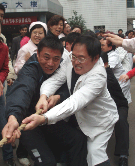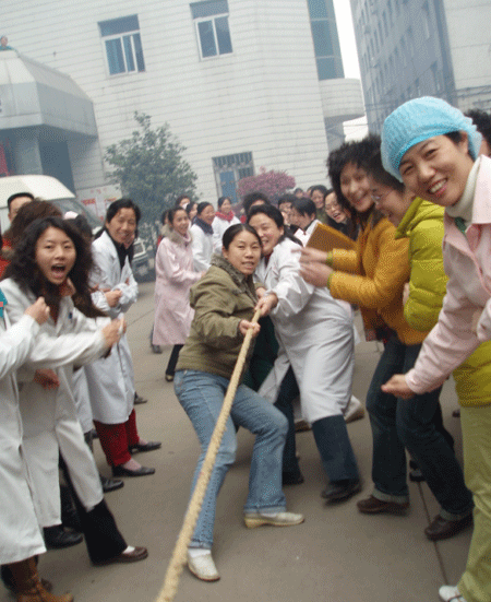 我院舉行撥河比賽(圖) 發(fā)布時(shí)間:2007年3月23日 預(yù)覽:4468次 3月21日下午,全院職工拔河比賽在外科大樓前坪舉行。12支代表隊(duì)參加比賽,分男女隊(duì)進(jìn)行。比賽結(jié)果:門(mén)診醫(yī)技隊(duì)、機(jī)關(guān)隊(duì)、外科隊(duì)分獲男隊(duì)冠亞季軍,外科隊(duì)、門(mén)診醫(yī)技隊(duì)、機(jī)關(guān)隊(duì)分獲女隊(duì)冠亞季軍。(建軍)
