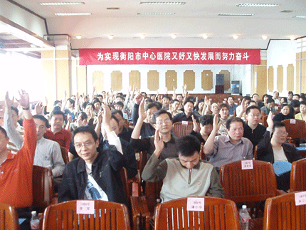 我院隆重召開第六屆一次職工代表大會(圖) 發(fā)布時間:2007年4月2日 預(yù)覽:5741次 團(tuán)結(jié)拼搏圖發(fā)展 創(chuàng)新管理求效益我院隆重召開第六屆一次職工代表大會 3月28日至31日,我院第六屆一次職工代表大會隆重召開。本次會議的中心議題是醫(yī)院發(fā)展與醫(yī)院管理。(鄒建軍)附:衡陽市中心醫(yī)院第六屆工會委員會工會主席名單(已經(jīng)3月28日第六屆一次職代會預(yù)備會議表決通過)工會主席:蔡春香衡陽市中心醫(yī)院第六屆工會委員會委員名單(已經(jīng)3月28日第六屆一次職代會預(yù)備會議選舉通過)工會委員:(按姓氏筆劃排列)王新平 王恩萍(女) 鐘三寶 柏太柱 曹凌云(女) 唐業(yè)華 曾利群(女) 詹濟(jì)舟 蔡春香 會議現(xiàn)場大會主席團(tuán)申錦林院長作醫(yī)院工作報告胡建輝副局長發(fā)表講話羅曉波副院長作醫(yī)院經(jīng)濟(jì)核算劉小平副院長作醫(yī)療安全管理代表分組討論代表們對相關(guān)報告進(jìn)行表決