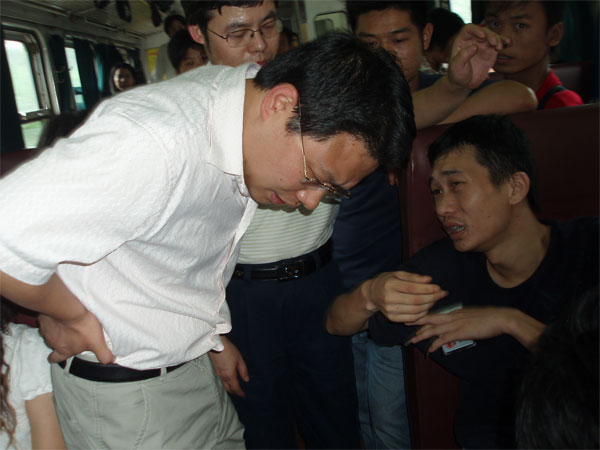 6月18日,市中心醫(yī)院院長申錦林教授帶領該院心臟中心和腦科中心學科負責人乘坐N605次列車赴廣東省人民醫(yī)院參加一個學術活動。下午2時,當列車即將行駛到韶關車站時,列車廣播突然喊話:“15號車廂有乘客病重,車上如有醫(yī)生,請速到現(xiàn)場?!鄙赍\林院長聽到后,立即安排心血管內(nèi)科博士蔣路平和醫(yī)務部部長唐業(yè)華趕去救援。由于當次列車乘客特別多,走道上擠滿了人,加上天氣悶熱,專家們在穿越了十幾節(jié)車廂時非常費勁。二十分鐘后,當專家們到達15號車廂時,衣服已被汗水濕透。乘客們看見專家來了,迅速騰出空間。專家們發(fā)現(xiàn),患病男子年約30多歲,臉色蒼白,大汗淋漓,呻吟不止。經(jīng)過診斷,專家們認為該男子是胃潰瘍引發(fā)絞痛,便立即實施簡單的手法治療和藥物治療,半個小時后,病人轉危為安,連聲道謝。